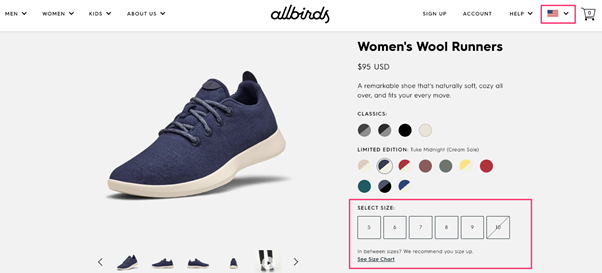 A moeda está, obviamente, em dólares americanos e as informações de tamanho são baseadas na numeração americana de calçados.