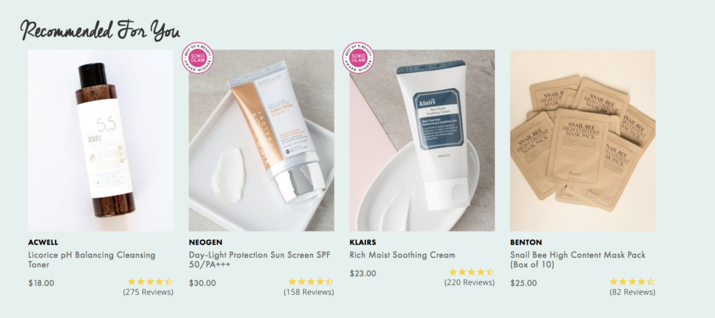 A Soko Glam apresenta uma seleção de produtos semelhantes sob o título “Recomendado para você”, informando aos clientes que as recomendações foram feitas considerando os seus interesses.