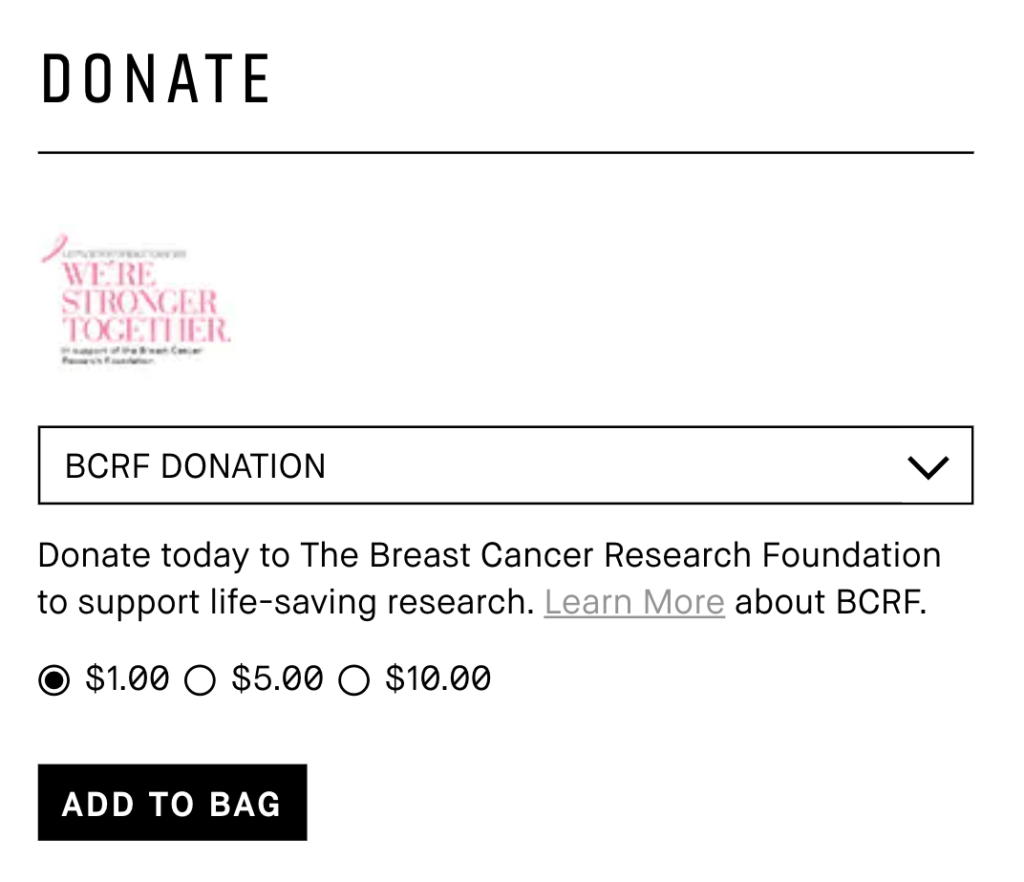 Before completing your order, you can select an organization to donate to, such as The Breast Cancer Research Foundation or She’s The First.