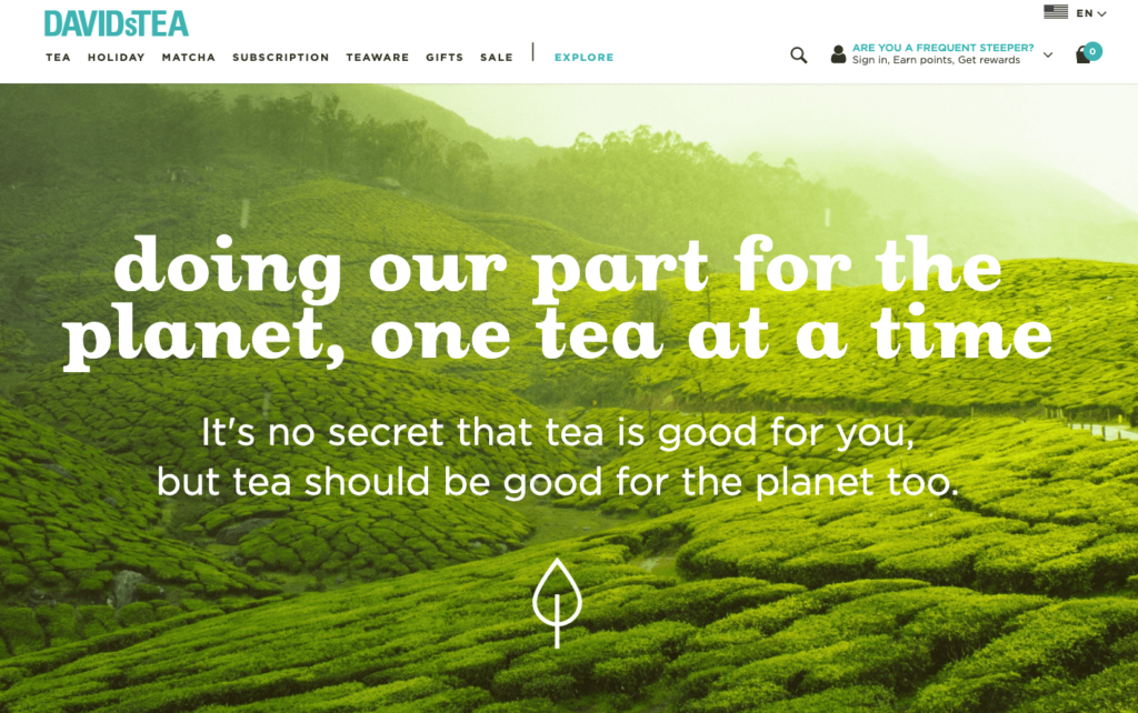 Clicking the link takes you to DavidsTea’s sustainability page—a long, detailed landing page explaining what the company is doing for the planet and how you can help.